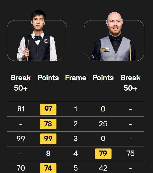 这一场比赛一开始,塔猜亚就马上进入状态,第一局直接打出单杆81分,轻松拿下,1-0领先。第二局,他继续强势,虽然没打出特别高的分数,但多次上手,最终以78比25再赢一局,比分来到2-0。第三局,塔猜亚火力全开,单杆轰出99分,直接一杆终结比赛,3-0领先。到了第四局,威尔逊终于找到感觉,单杆打出了75分,以79比8扳回一局,把比分追到3-1。