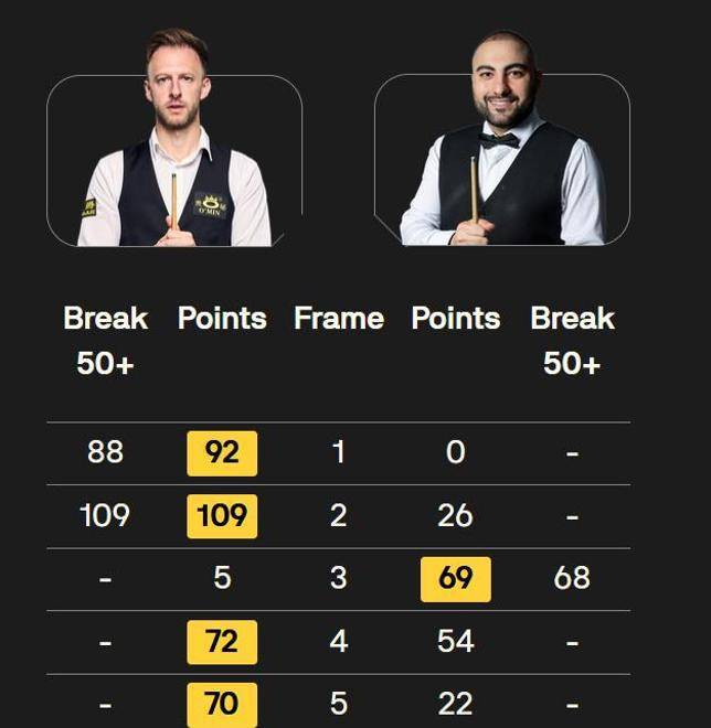 这场比赛,特鲁姆普表现得特别出色。前两局,瓦菲机会不多,特鲁姆普连续打出单杆88分和109分,轻松连赢两局,2-0领先。第三局,瓦菲终于拿到68分,勉强扳回一局,比分来到1-2。第四局双方打得非常胶着,但还是特鲁姆普更稳,多次上手,以72比54险胜,上半场结束时,特鲁姆普3-1领先。